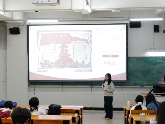 田选意同学则以手抄报形式直观呈现学习成果,聚焦党的二十届四中全会精神展开分享。她认为全会公报既总结了 “十四五” 时期的辉煌成就,更为 “十五五” 发展锚定方向。作为学生干部,她承诺将把全会精神融入日常,主动关心帮助师弟师妹,在识变应变中明确成长方向,在服务发展大局中展现担当。