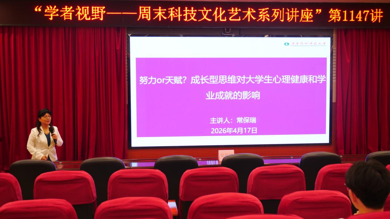 为帮助同学们树立积极健康的思维模式,缓解学习生活压力,提升自我成长能力,我院于2026年4月17日下午14:30在白云校区三教104报告厅成功举办《努力or天赋?成长思维提升学业成就和心理健康水平》主题讲座。本次讲座特邀常保瑞教授主讲,周咏婷老师主持,全校学生共同参与。