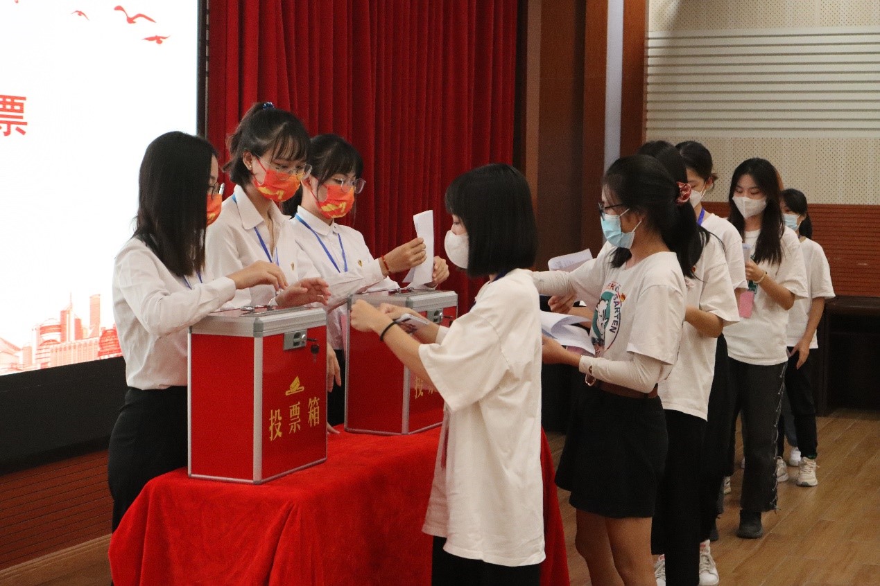 接下来是选举新一届团委、学生会委员会委员。在主持人宣布完候选人名单后,老师、同学们依次上台竞选演讲。在候选人演讲完毕后,按照公平、公正、公开的原则,各学生代表有序上台投出自己宝贵的一票。