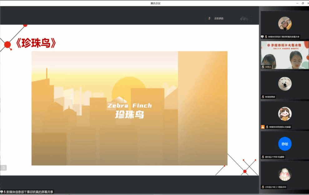 经过初赛阶段的评选,共有三十余份作品脱颖而出进入本次决赛。参赛作品分为创意开发类、艺术设计类、动画类以及课件类共四类组别,在主持人宣读比赛规则过后,比赛正式开始。选手们通过共享屏幕的形式进行展示并连麦对自己的作品进行讲解介绍。首先出场的是创意开发类,此类作品主要分为软件开发、网页开发及移动应用开发和小程序开发。接着是艺术设计类作品,该类作品分为电子海报设计、VR/AR全景图设计和数控编程设计。第三个出场的是动画类作品,此类作品包括动画视频和动画形象设计。最后出场的是课件类作品。课件类分为微课和交互式课件。