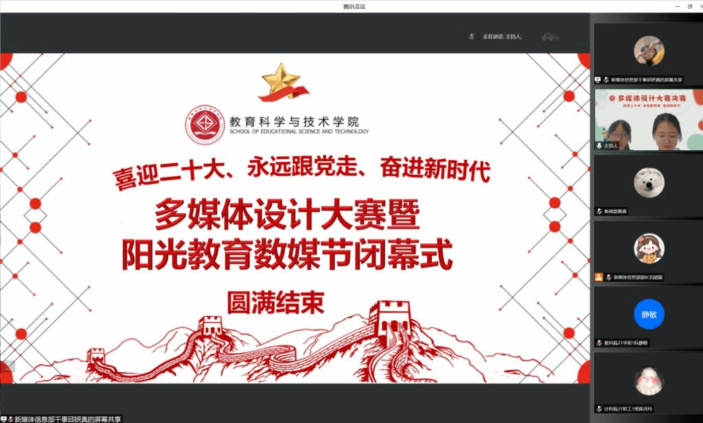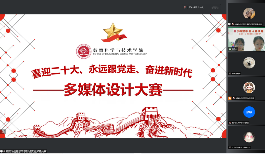 为展示我校学生的专业技能水平,激发学生对多媒体创作和技术的热情,同时更好的展现校园文化的现代化创新氛围,教育科学与技术学院于2022年6月6日晚6:30在腾讯会议举办了以“喜迎二十大、永远跟党走、奋进新时代”为主题的多媒体设计大赛决赛。