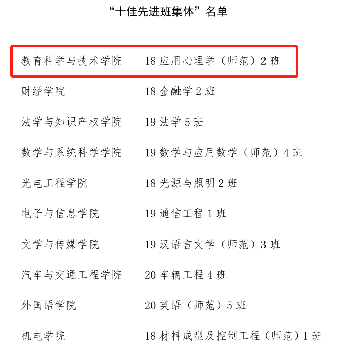教育科学与技术学院历来始终高度重视班级建设,以班级建设为基础培育良好班风、学风,不断丰富班级建设内涵,打造良好育人环境。在此次评选活动中,学院在班级自主申报的基础上,遴选出思想引领深入落实、班级文化特色鲜明、学生工作扎实有序的优秀班集体参与学校“十佳先进班集体”评选。今后,我院将深入总结先进班集体创建工作经验,进一步推动党团班一体化建设,以典型带动全体,进一步落实立德树人根本任务。