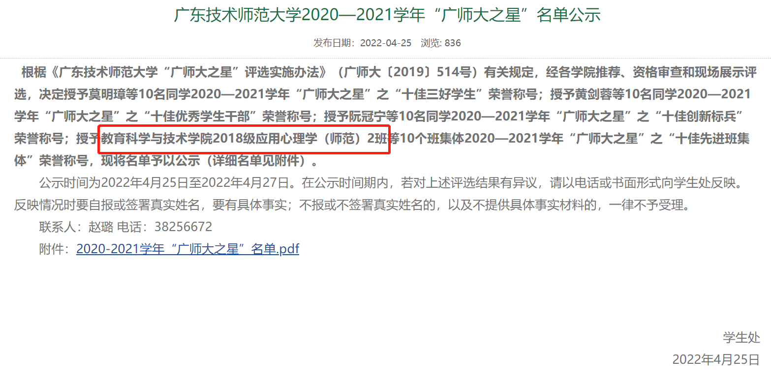 近日,2020-2021学年bevictor伟德官网 “广师大之星”之“十佳先进班集体”评选活动落下帷幕。经过层层选拔、推荐审核和现场展评,我院2018级应用心理学(师范)2班荣获“广师大之星”之“十佳先进班集体”荣誉称号。