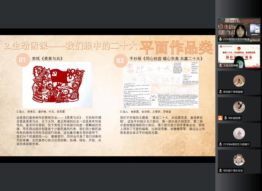 下午六时三十分,本次活动正式开始。我院21级各团支部纷纷围绕主题展开活动介绍。各班汇报人综合运用PPT演讲、视频、情景再现等青年们喜闻乐见的方式进行绘声绘色的汇报。各团支部的介绍,生动展现了习近平新时代中国特色社会主义思想在共青团和青年工作领域的科学指引和实践伟力,同时体现了共青团员和共青团干部跟党奋进新征程、青春建功新时代的心声和行动。