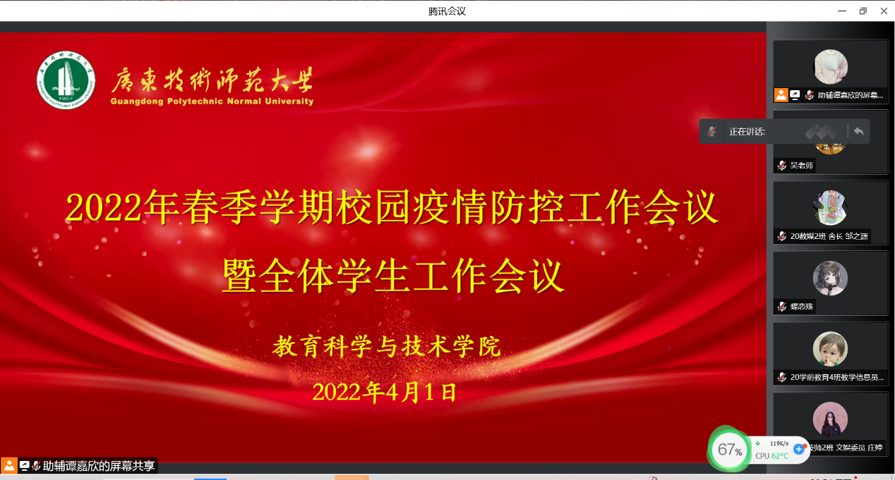 为全面落实落细学校《关于从严从紧从细做好当前学校疫情防控工作的通知》要求,进一步加强对我院学生新冠疫情防控教育,提高学生的自我保护意识,强化防疫思想认识,切实落实校园的防疫工作,同时提点学生在学习与生活需要注意的问题,教育科学与技术学院于4月1日晚在线上腾讯会议召开校园疫情防控工作会议暨全体学生工作会议。学院2020各班班委、学生党员、全体宿舍长、楼长约200余人参加本次会议,会议由辅导员吴晨阳老师主持。