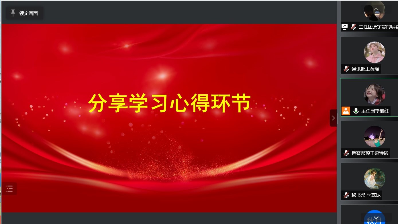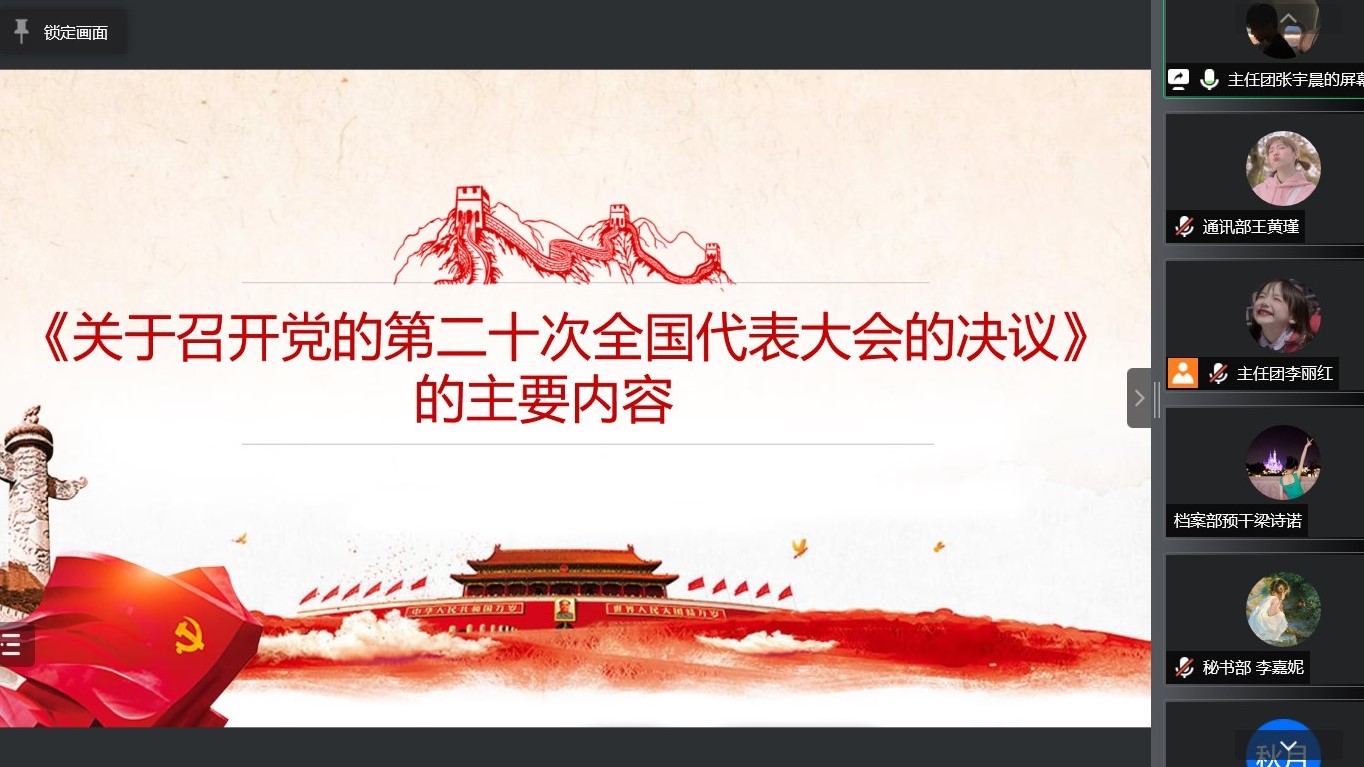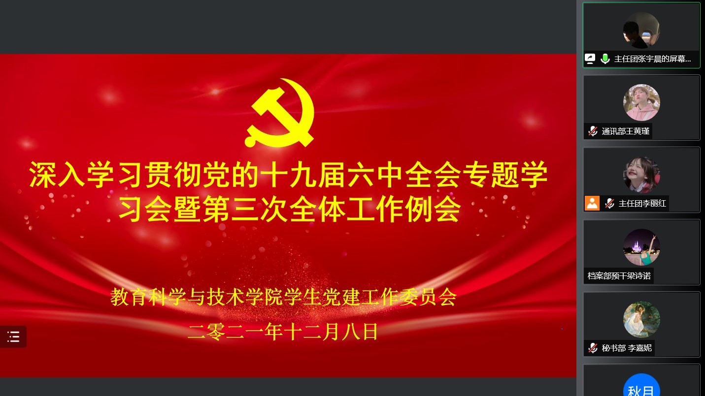 2021年12月8日,为学习和传达党的十九届六中全会精神,教育科学与技术学院学生党建工作委员会于线上召开了深入学习贯彻党的十九届六中全会专题学习会暨第三次全体工作例会。本次会议由学生党建工委副主任李丽红主持,专职组织员吴晨阳老师和全体成员参加会议。
