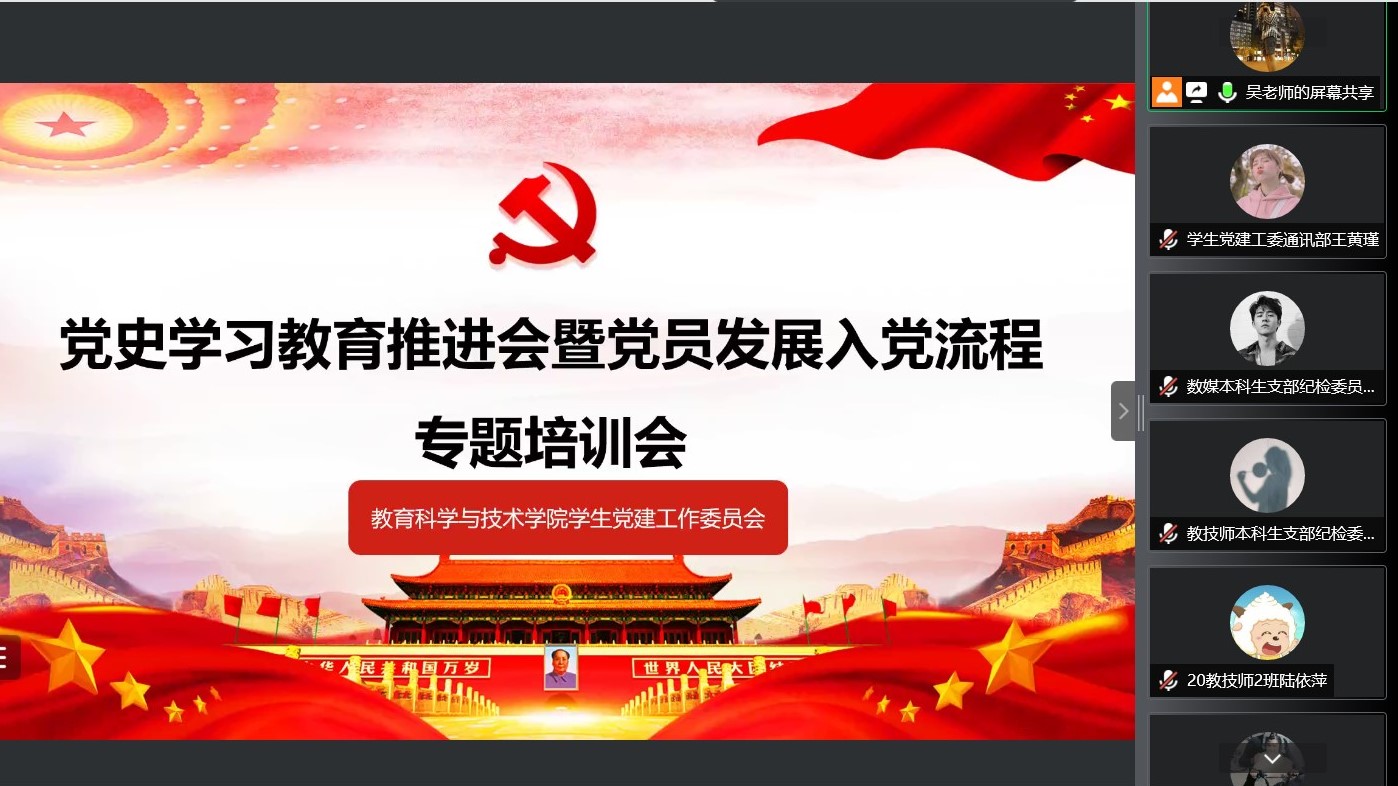 为贯彻落实学校党委党史学习教育工作部署安排,总结回顾前一阶段的工作,推进学院学生党史学习教育再上新台阶,同时扎实做好学院本学期发展党员工作,11月2日晚上,教育科学与技术学院召开学生党史学习教育推进会暨党员发展入党流程专题培训会。学院专职组织员吴晨阳老师主持会议,各本科生、研究生党支部委员会委员,各团支部书记和学生党建工委全体成员参加会议。