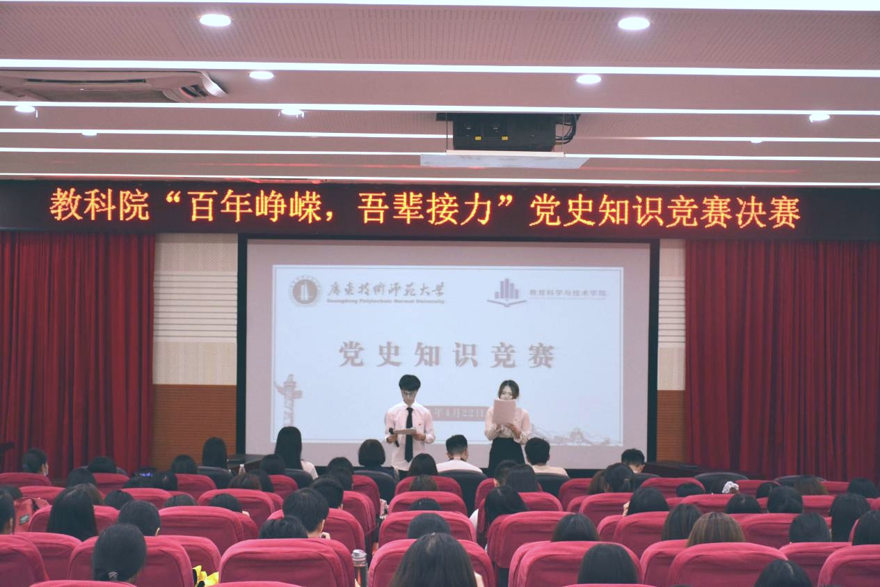 嘉兴青册传华夏,党史金光灿霓霞。2021年是中国共产党百年华诞,百年征程波澜壮阔,百年初心历久弥坚。为了铭记党的历史,继承和发扬党的优秀作风,加强我院学生的思想教育及宣传党建知识,我院于2021年4月22日晚上18点30分在白云校区第三教学楼104报告厅举行以“百年峥嵘,吾辈接力”为主题的党史知识竞赛决赛。出席本次决赛的嘉宾有我院党委副书记吴水爱,辅导员黄立,团委学生副书记刘晓潼,团委学生执行副书记叶全鸿,学生会主席团成员潘梓豪、张静桦、任弘然。