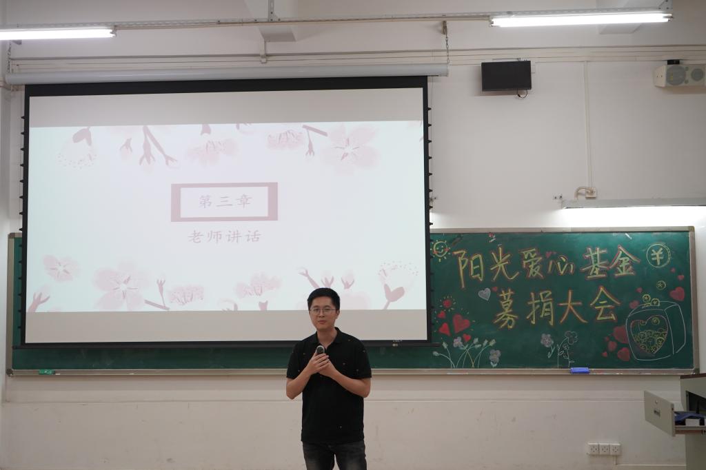 献出一份爱心,点亮一份希望。为培养我院学生爱心奉献精神,帮助有困难学生顺利渡过难关,教育科学与技术学院于2021年4月20日17时于白云校区第三教学楼101教室举办了第四届阳光爱心基金募捐大会。莅临本次会议的领导嘉宾有辅导员黄立老师,团委副书记刘晓潼,学生会主席团成员潘梓豪、张静桦、任弘然,前阳光爱心基金会会长曹倚帆以及20级各班组宣委员。
