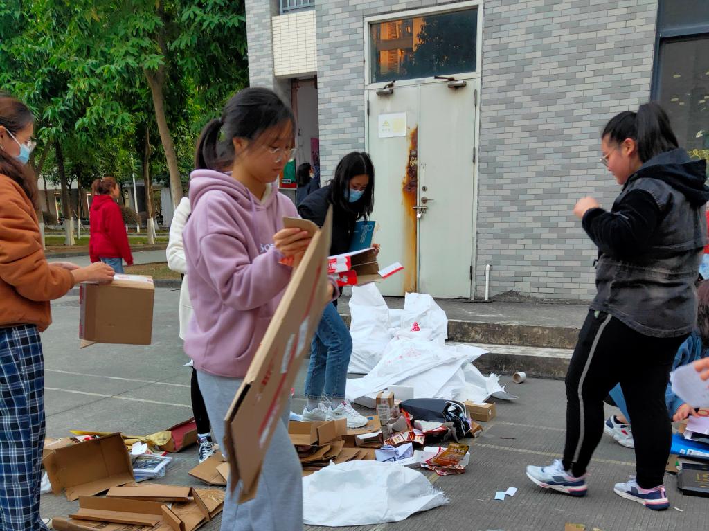 志愿者们到达宿舍楼下领取回收袋后,以小组的形式前往各个宿舍进行废品回收。他们热情高涨,充满干劲,去到每一间宿舍收集各类废品,最后齐心协力把满满当当的回收袋送到宿舍楼下,并对废品进行分类、整理、搬上回收车。