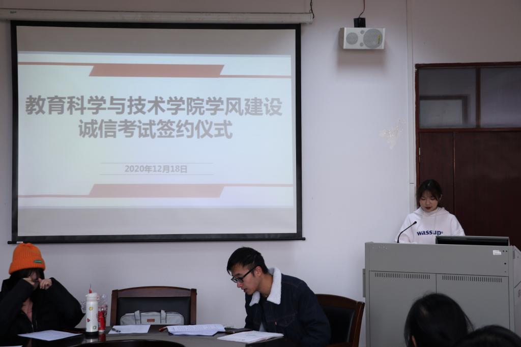为加强学校学风建设,创造公平竞争的考试环境,在校园内形成以诚信为荣、以失信为耻的良好氛围,教育科学与技术学院于2020年12月18日下午16:45在白云校区第一教学楼315教室举行了教育科学与技术学院学风建设诚信考试签约仪式,参加本次会议的有我院团委、学生会主席团成员和各班学习委员。会议由主席团成员张静桦师姐主持。