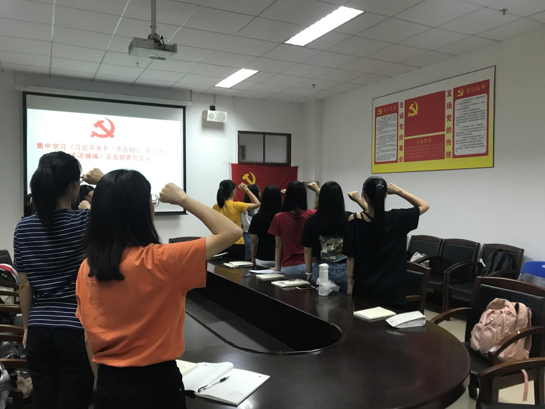 首先,全体与会党员认真对照《中国共产党章程》、《关于新形势下党内政治生活的若干准则》、《中国共产党纪律处分条例》进行自我检查,认真检视自身的差距与不足,并就“党员入基层”等活动的自我感受进行发言。随后,全体党员集中学习《习近平“不忘初心,牢记使命”论述摘编》,大家相互交流心得体会,并在李聪莹同学的带领下重温入党誓词,入党誓词的每一句话,字字千钧,概括了党对党员的基本要求,也概括了党员对党组织和党的事业所应承担的政治责任。