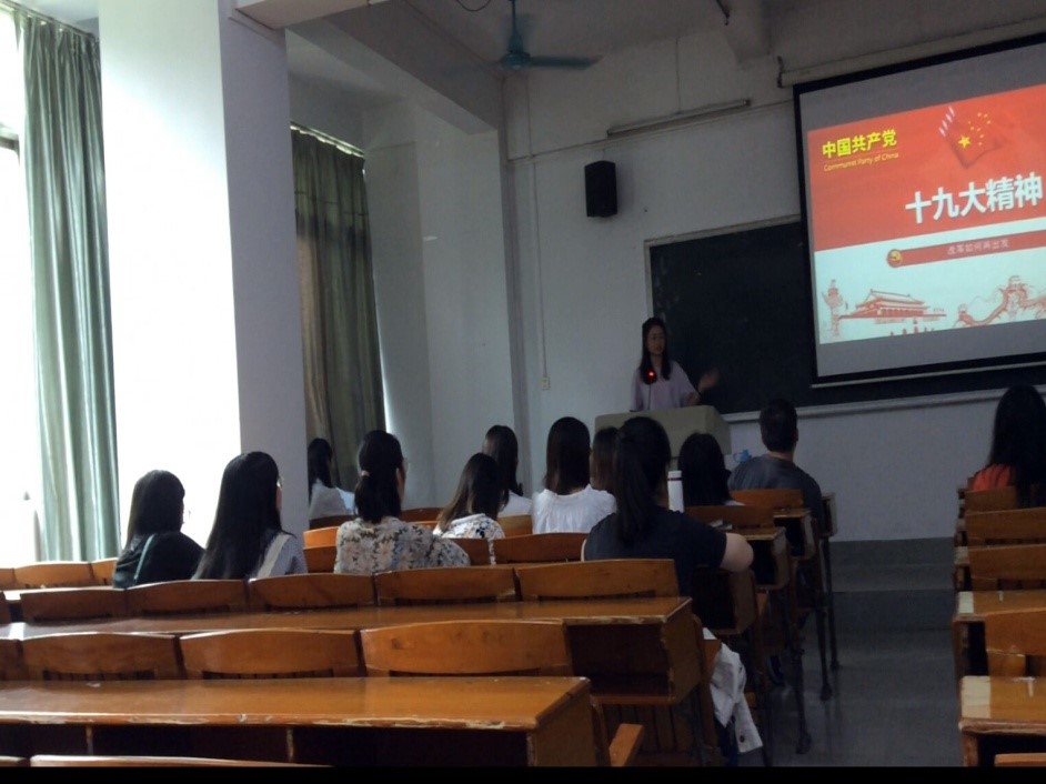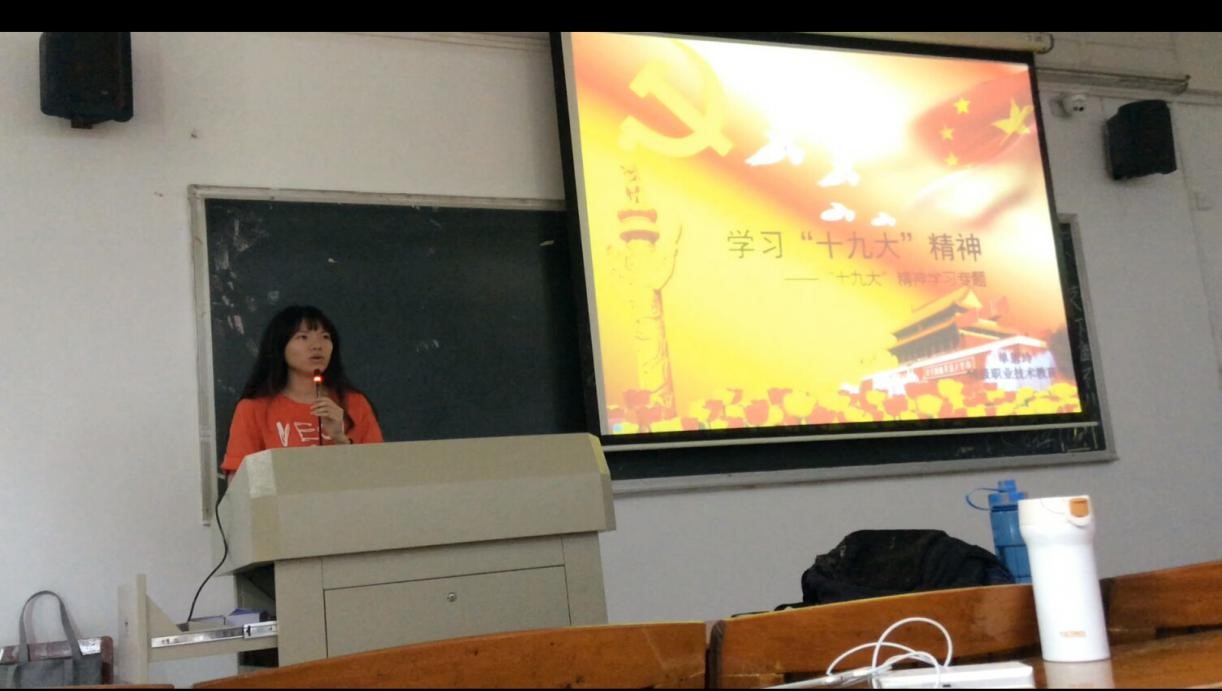 此次团学活动共分为四项议程进行。活动的第一项内容是分别由团员代表16级职业技术教育学单恩玲同学、18级现代教育技术王敏同学、18级职业教育技术学王峰同学以学习十九大精神为主题进行专题演讲。