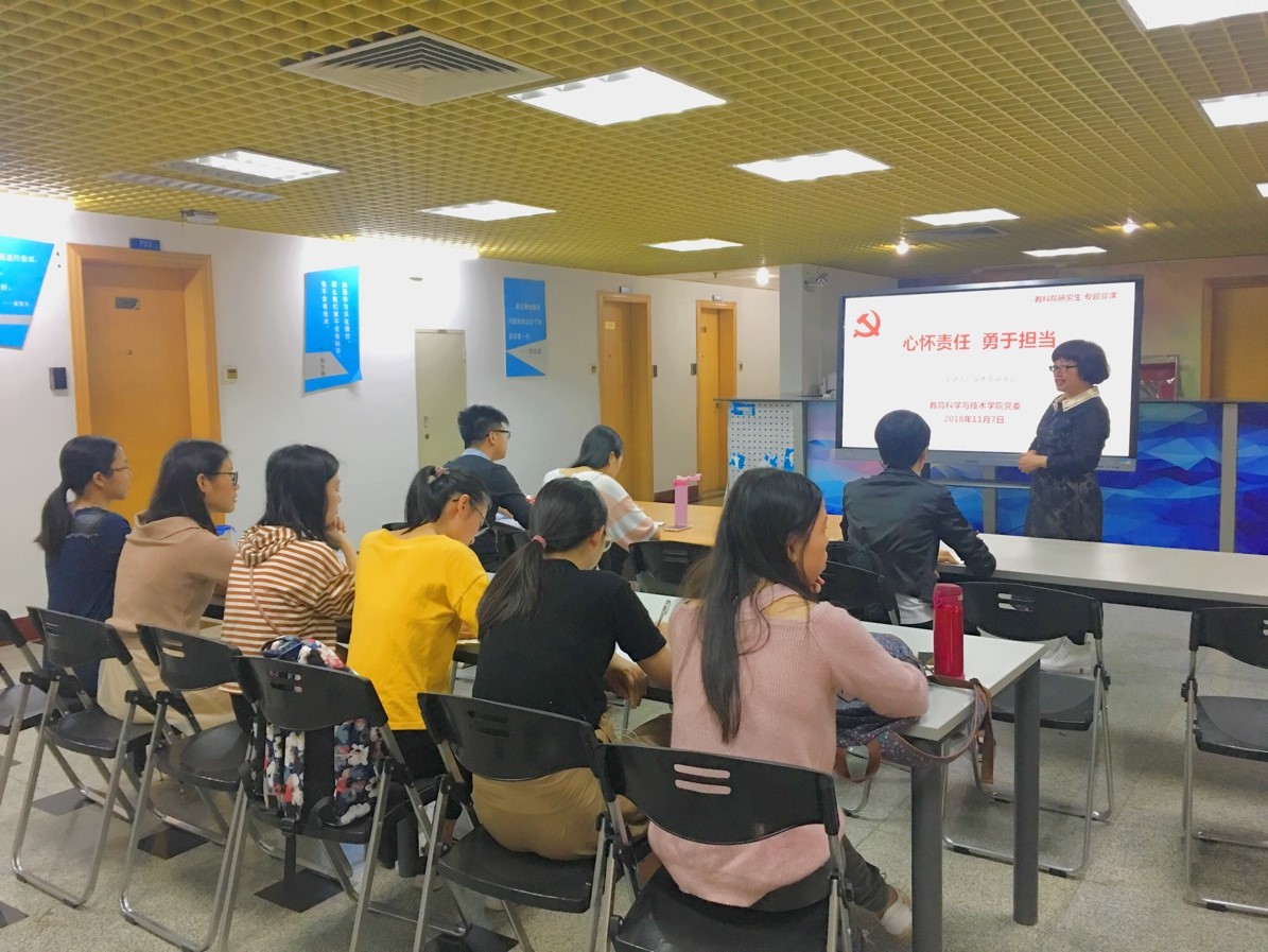 2018年11月7日上午,在校本部工业中心会议室,教科院研究生第二党支部召开《新时代 新担当 新作为》专题党课,邀请了林启词书记给我们作了“学习习近平总书记系列重要讲话精神”报告,吴水爱副书记给我们上了“心怀责任,勇敢担当”的专题党课,共计10名党员同志参加了此次学习。
