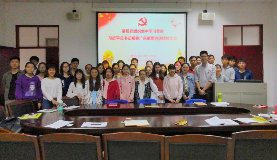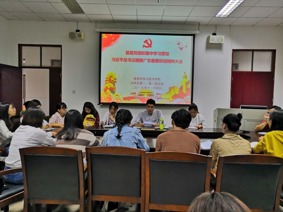 为深入学习贯彻习近平总书记视察广东重要讲话精神,2018年11月4日上午,教育科学与技术学院本科生第一、第二党支部在一教315会议室集中召开了习近平总书记视察广东重要讲话精神学习会议。本科生党建负责人、支部书记吴晨阳老师,党支部全体党员同志和我院本学期入党积极分子培训学员共40余人参加了本次学习会议。