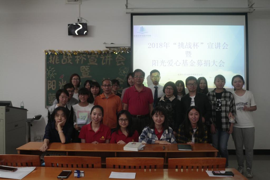 最后,在嘉宾和所有工作人员合影留念中,此次“挑战杯”宣讲会暨阳光爱心基金募捐动员大会圆满的落下了帷