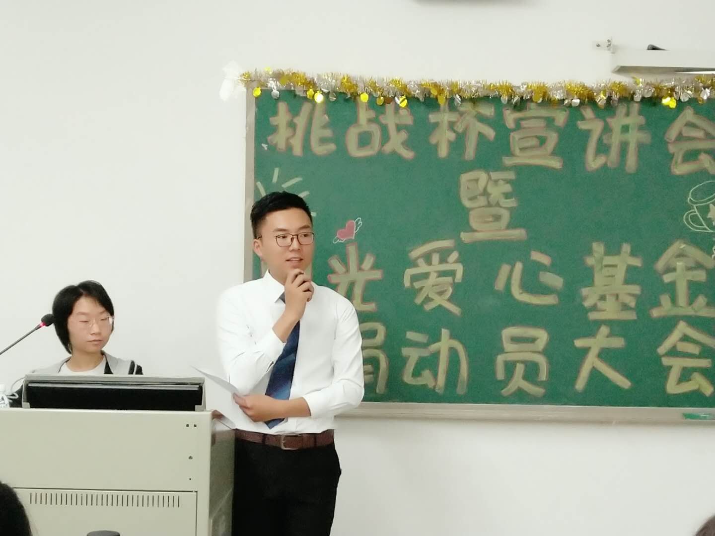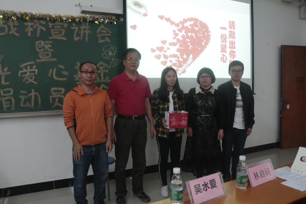2018年4月18日晚,教育科学与技术学院在二教301课室如期举办了“挑战杯”宣讲会暨阳光爱心基金募捐大会。出席本次活动的嘉宾有党委书记林启词老师、党委副书记吴水爱老师、 团总支书记王孜老师、我院往届参加过“挑战杯”的优秀学生、各二级学院团副及学院各年级的学生代表。本次大会有两项议程:一是“挑战杯”宣讲会,二是阳光爱心基金募捐大会。主持人由艺术团司仪队蒙博睿担任。