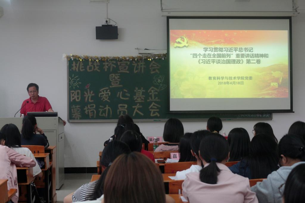 为了让我们更好的了解并且学习贯彻习近平总书记的“四个走在最前列”的重要讲话精神以及《习近平谈治国理政》第二卷,加强和改进思想政治工作,全面从严治党大学生廉洁教育专题等系列思政教育工作,我院林启词书记于2018年4月18日(即星期三晚上)在白云校区二教301为我们开了这个专题讲座。