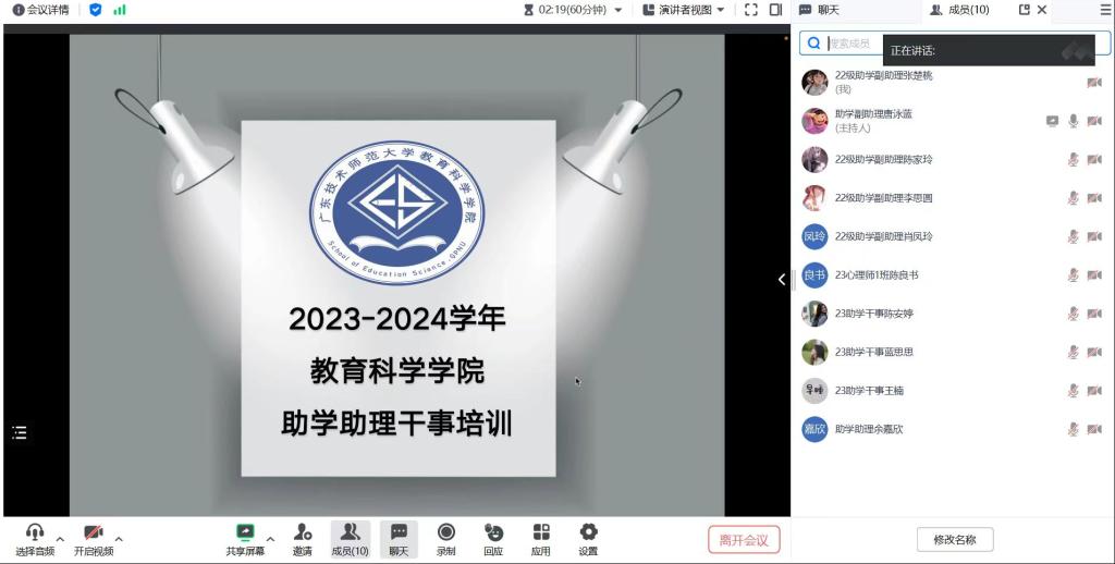 为了进一步优化助学服务工作,我院勤工助学服务中心于2024年2月7日晚上十点召开了一场2023级新生助学干事线上培训会。本次会议主要从以下几方面展开:学院领导以及学院助理团介绍、明确助学干事具体职责、列举助学工作的注意事项、详细介绍助学工作的具体时间安排、分享助学工作经验并对助学干事提出的问题一一解答。这次会议不仅让助学干事更明晰自身工作职责,还提高了助学工作小组的合作能力,便于我院后续助学工作的顺利开展。