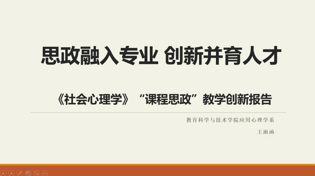 王雨函老师以《社会心理学》为例撰写了课程思政创新报告与教学设计创新报告。她提出了思政融入专业,创新并育人才的理念,对学习者进行了精准的分析,指出学生正处于青春期到青年期的交界,存在易感性和受暗示性,未定型的三观面对复杂的世界,思维存在一定局限性。她从聚焦思政大方向,扎实提升教学质量,帮助学生掌握科学的唯物主义方法论,引导学生形成马克思主义文化观,通过翻转课堂、研究性学习、小组研讨等教学方法和学习结果评价机制的使用引导目标达成。