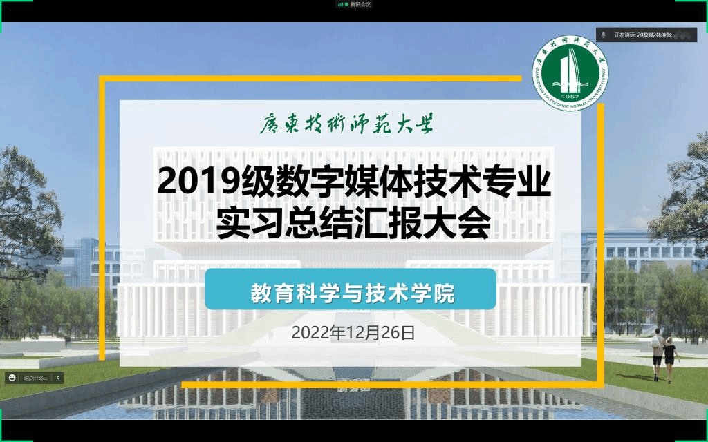 2022年12月26日,教育科学与技术学院2019级数字媒体技术专业实习总结汇报大会顺利在腾讯会议线上召开。我院数字媒体技术系主任伍国华老师,专任教师许晓安老师、李端强老师以及数字媒体技术专业2019级、2020级的同学参加了此次总结汇报大会,会议由来自20数媒2班的林境海同学主持。
