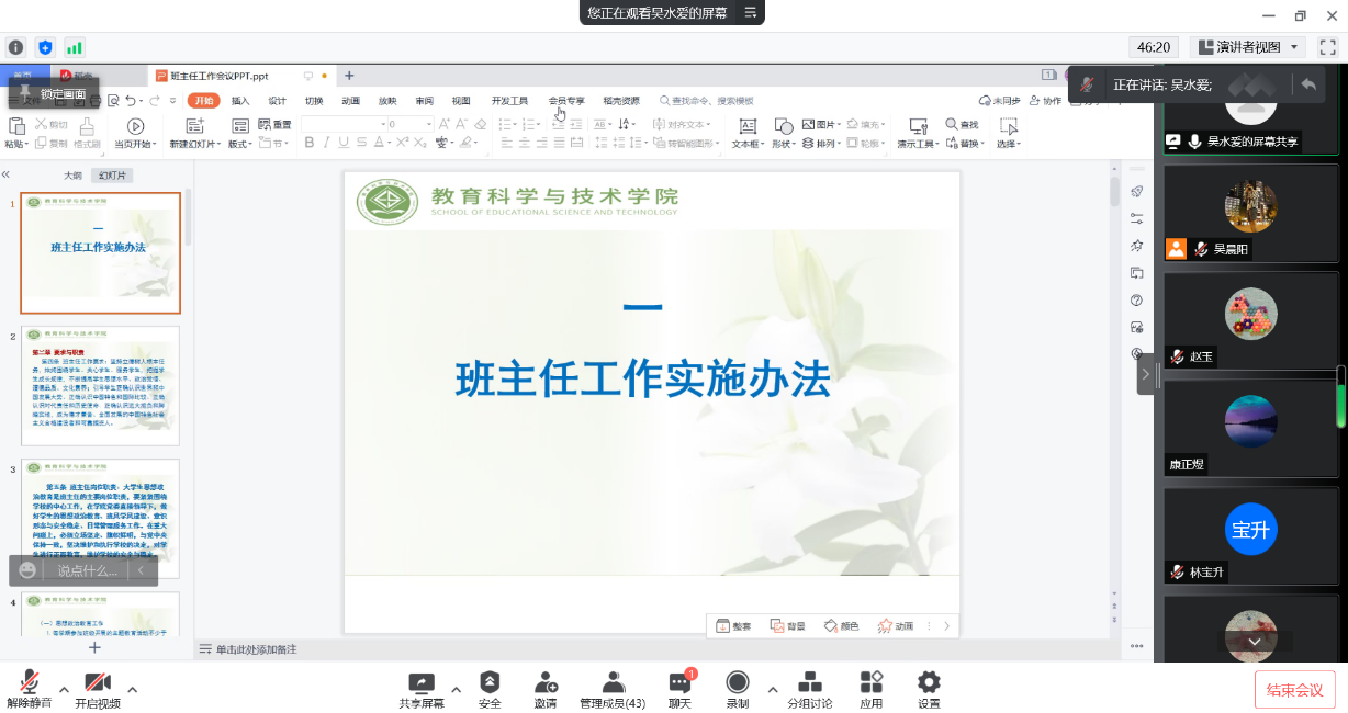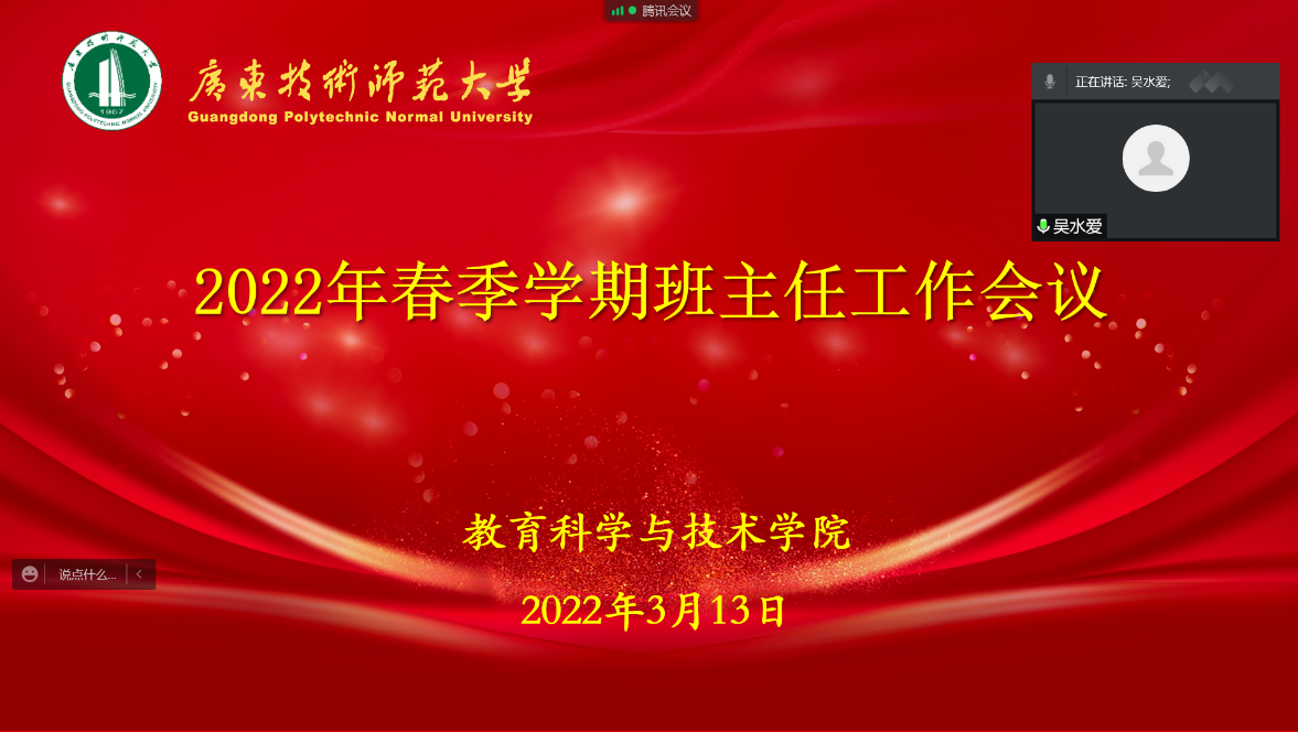为统筹推进疫情防控工作,进一步明确班主任本学期工作重点,交流工作经验和心得,提升育人实效,圆满完成本学期教育教学任务,教育科学与技术学院于3月13日晚以线上方式召开2022年春季学期班主任工作会议。学院党政领导班子成员,全体班主任和专兼职辅导员老师参加会议。