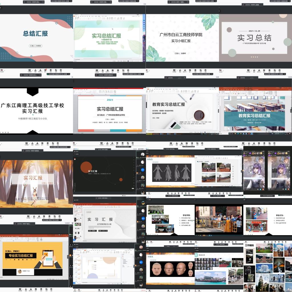 2018级教育实习共有广东江南理工高级技工学校、广州市白云工商技师学院、广州市天河职业高级中学、广州科技贸易职业学院、佛山市南海区第一职业技术学校五个集中实习小组以及3个自主实习小组;专业实习共有6个实习小组。每个实习小组的实习生代表依次向老师和同学们介绍了自己小组的实习情况,并通过详实生动的PPT向大家展示了为期16周的实习成果。展示的内容包括实习内容(教育实习为:对实习学校情况的基本介绍、工作内容、听课和授课情况、第二课堂及专业技能工作;专业实习为:各自岗位需要完成的专业性工作)、收获与心得、实习中存在问题的反思以及对师弟师妹的建议等。