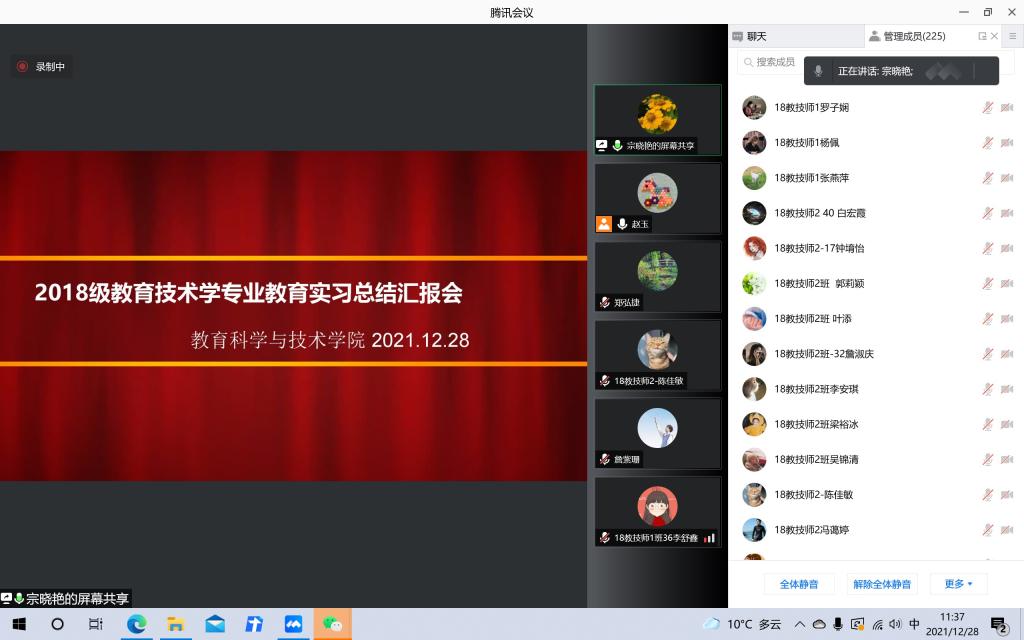 2021年12月28日上午,教育科学与技术学院2018级教育技术学专业教育实习总结汇报会在线上顺利召开。我院教育技术系系主任赵玉教授、专业负责人周元春副教授、黄芳明老师、黄石华老师、伍国华老师、宗晓艳老师以及教育技术学专业2018级和2019级全体学生及部分2020级、2021级学生参加了汇报会,大会由赵玉老师主持。
