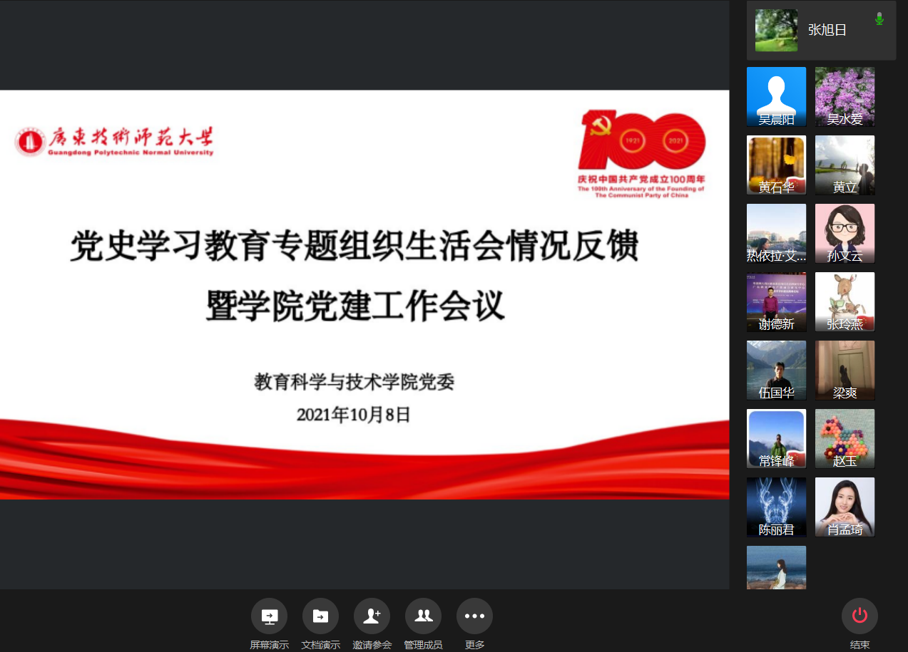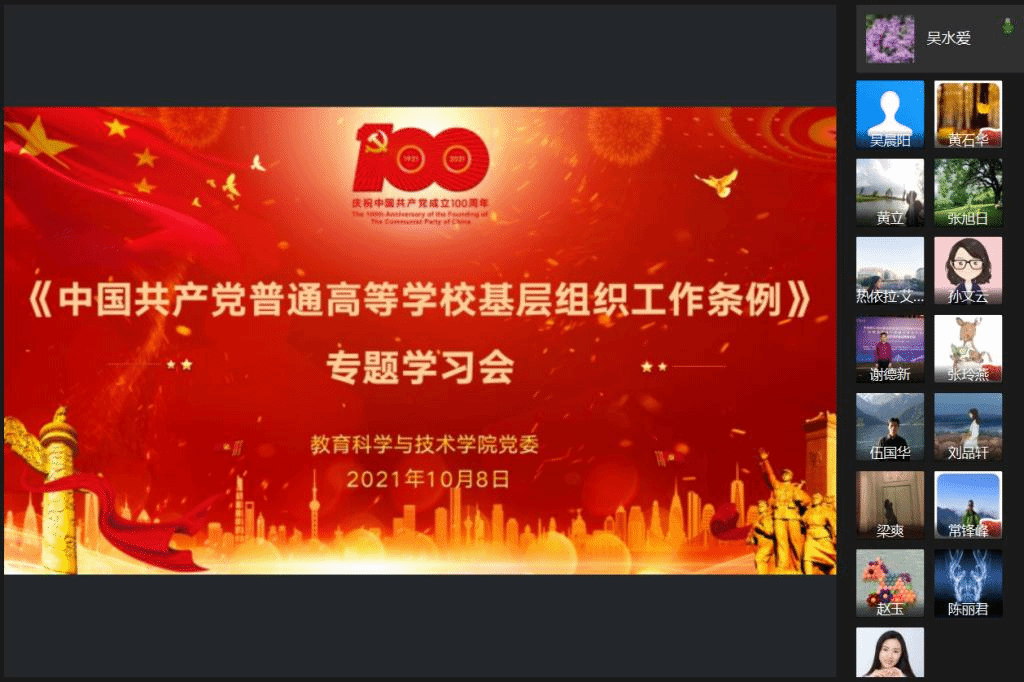 10月8日,教育科学与技术学院召开党委理论学习中心组(扩大)学习会暨党建工作会议,专题学习《中国共产党普通高等学校基层组织工作条例》并推进党史学习教育。党委理论学习中心组成员张旭日、吴水爱、陈丽君、谢德新、常锋峰参加学习会,全体教师党支部书记、学生党支部书记列席学习会。会议由专职组织员吴晨阳主持。