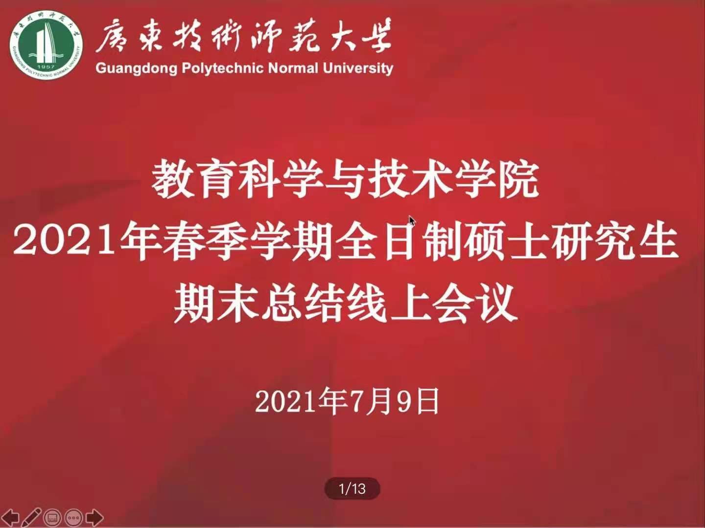 7月9日晚上,教育科学与技术学院在腾讯会议平台召开2021年春季学期全日制硕士研究生期末总结大会。会议由教育科学与技术学院副院长陈丽君主持,学院党委书记张旭日、院长陶红、学院党委副书记吴水爱,副院长谢德新、研究生教学部主任伍国华、研究生辅导员梁爽、研究生秘书刘品轩以及2019级和2020级全体全日制研究生参加了会议。