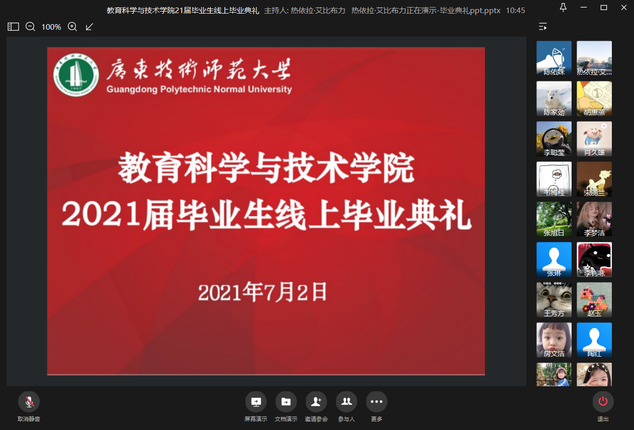 为进一步做好我院2021届毕业生就业创业工作,庆祝毕业生顺利完成学业,开启人生崭新的篇章,7月2日,我院举办2021届毕业生线上毕业典礼。学院党委书记张旭日、院长陶红、副书记吴水爱、副院长陈丽君、副院长谢德新、副院长吴天生、党政办主任常锋峰、系主任赵玉、孙文云,各毕业班班主任、辅导员、教务员老师和全体研究生及本科毕业生参与这次线上毕业典礼。毕业典礼由辅导员热依拉老师主持。