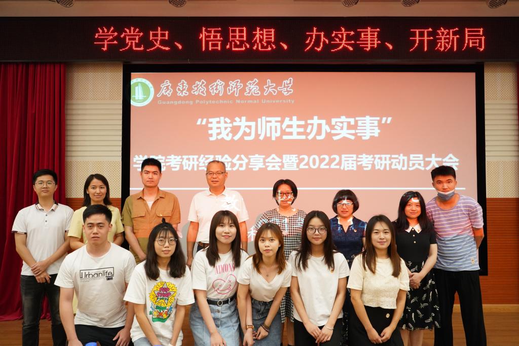 学党史办实事,为进一步将学院的学风建设工作与考研就业有机结合起来,促进学风建设工作与考研就业相互作用、相互渗透,进而形成“抓考研、促学风”的良好局面。5月14日,我院在白云校区三教104报告厅举办了考研经验分享会暨2022届考研动员大会。学院党委书记张旭日、院长陶红、院党委副书记吴水爱、副院长陈丽君,辅导员吴晨阳、热依拉、黄立,17级教技师1班班主任余佳恕老师以及17级考取研究生学生,18、19、20级有考研意向的学生200余人参加了分享动员会。会议由学院党委副书记吴水爱主持。