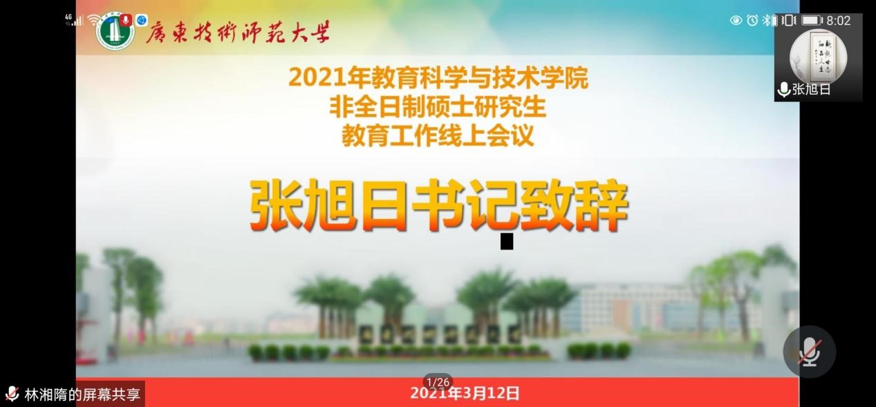 为进一步加强推动和完善我院非全日制硕士研究生的管理工作,提高非全日制硕士研究生的培养质量,教育科学与技术学院于3月12日在腾讯会议平台召开了2021年非全日制硕士研究生教育工作线上会议。学院党委书记张旭日,院长陶红,副院长陈丽君,研究生辅导员梁爽,研究生教学秘书刘品轩,部分导师以及全体非全日制硕士研究生参加会议,会议由学院党委副书记吴水爱主持。