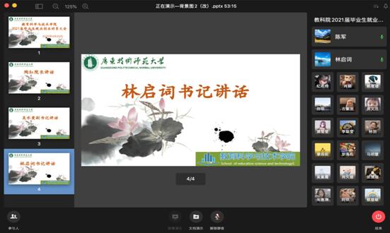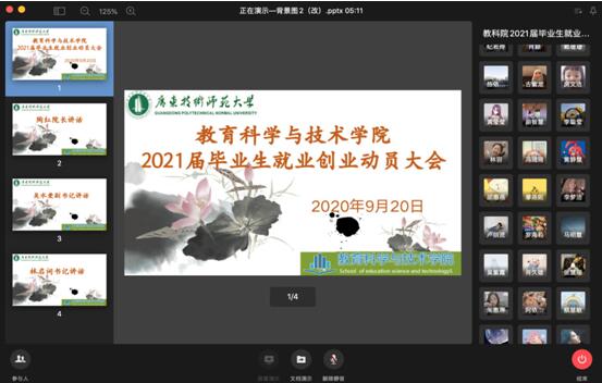 按照学校相关工作部署,为全力做好我院2021届毕业生就业创业工作,增强毕业生的核心竞争力和主动就业意识,9月20日,教育科学与技术学院召开2021届本科毕业生就业创业动员大会。学院党委书记林启词、院长陶红、副书记吴水爱、副院长谢德新、副院长陈丽君、副院长吴天生、党政办主任常锋峰、各系主任赵玉、孙文云、张玲燕、陈雪梅、陈军、方向阳、各毕业班班主任、辅导员、研究生导师等老师和全体本科和研究生毕业生参会。会议由辅导员热依拉老师主持。