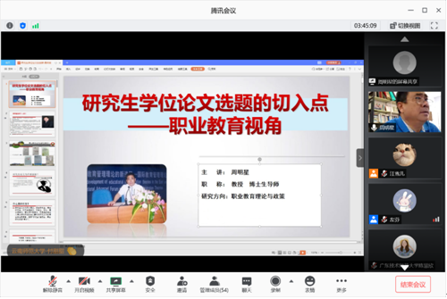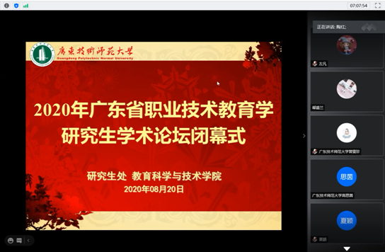 2020年8月15日至20日,由bevictor伟德官网研究生工作处、教育科学与技术学院举办的“2020年广东省职业技术教育学研究生学术论坛”通过腾讯会议平台顺利举办。教育科学与技术学院院长陶红教授、研究生处副处长陈泳竹教授以及项目主要成员出席开班典礼,来自云南师范大学、重庆师范大学、bevictor伟德官网的研究生学员47名参与会议、旁听会议者数名。陶红教授与陈泳竹教授先后进行开幕致辞。
