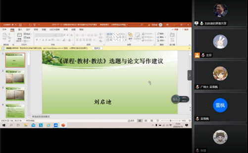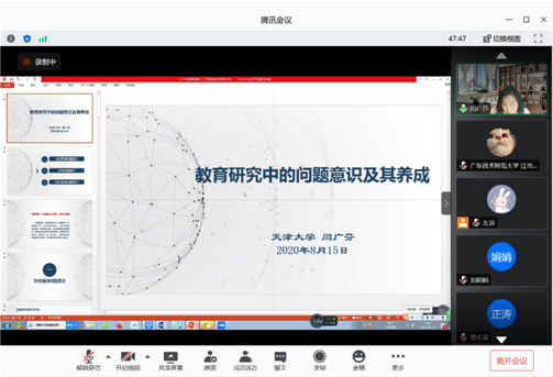 8月20日下午,2020年广东省职业技术教育学研究生学术论坛闭幕式在线上顺利召开。教育科学与技术学院院长陶红教授、谢德新副教授、曹育红教授以及学术论坛学员47人参加结业典礼。结业典礼由谢德新副教授主持并宣读论坛优秀论文名单、关于同意颁发学员结业证书的决定。来自重庆师范大学的周可欣、云南师范大学的沈娟、以及本校的夏颖、方菁华、刘娟娟、冉燕、马洁、孙旭洋、邓小莉等9位学员代表先后就为期六天的论坛学习分享自己的心得、收获与期望。随后,研究生导师代表曹育红教授基于“道”“法”“术”“器”四点进行发言,向学员们分享理解世界、与世界打交道的思维模式与学习方法。最后,由陶红教授作总结发言。