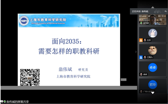 《教育发展研究》资深编辑翁伟斌研究员,围绕“面向2035:需要怎样的职业科研”的主题展开报告。讲座伊始,翁教授从时间、空间两大维度对职业教育与普通教育的区别进行阐述,基于“仁川宣言”五个关键词,深入解读国家职教二十条,并对职业教育十大研究主题进行梳理,从“研究目的”、“研究主体”、“ 研究方式”等角度思考研究范式,为学生指明了职业教育科研未来的研究方向、研究热点与选题重点。