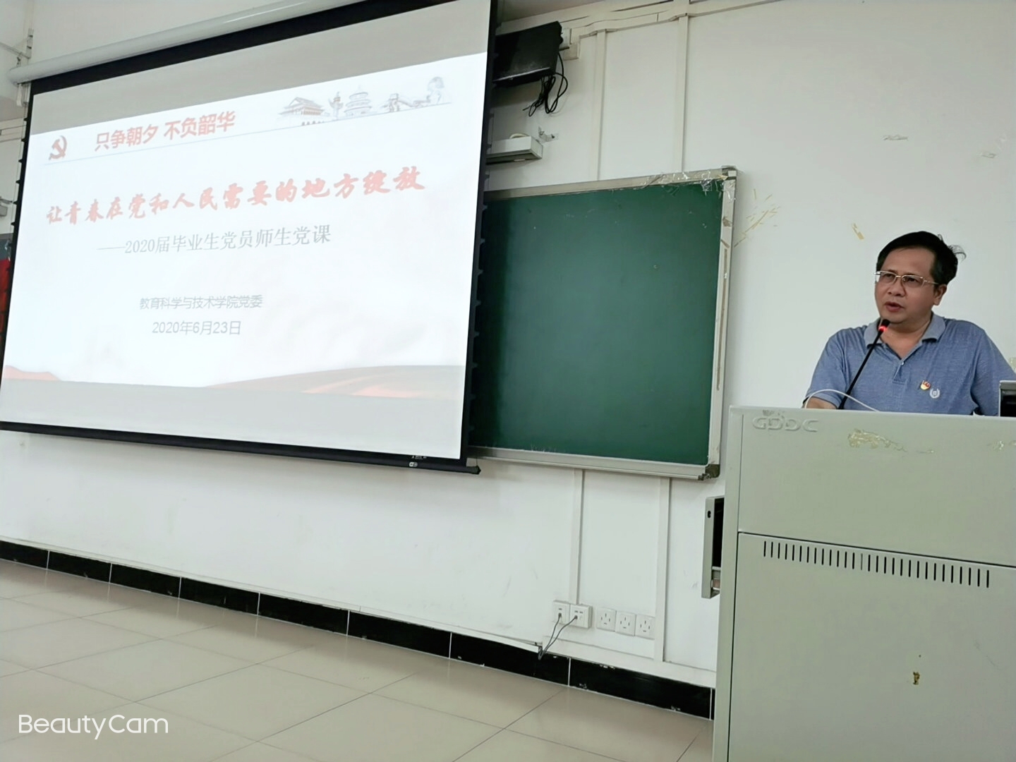 在2020届毕业生即将告别母校之际,为进一步增强毕业生党员的母校荣誉感和社会责任感,加强对毕业生党员的教育与培养,引导毕业生党员保持先进性,6月23日下午,教育科学与技术学院党委在三教201教室组织开展以“只争朝夕,不负韶华”为主题的2020届毕业生党员教育会议。学院党委书记林启词、党委副书记吴水爱、研究生第三党支部书记张晓颖老师以及全体毕业生党员出席会议,会议由学院专职组织员吴晨阳老师主持。