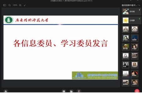 接下来,各班学习委员、教学信息员分别对线上教学情况、教学管理及同学们的学习状况进行了反馈。同学们对任课教师能够认真备课,较好地组织开展线上课堂教学表示肯定,并赞扬老师都能提供丰富的资源帮助学生课后进行自主拓展学习,同时指出个别教师的课堂教学比较沉闷,师生互动少,语速过快,某些课程难度偏大,节奏偏快,且直播课堂无法查看回放,学生难以有真正的学习收获。希望老师能增加师生互动环节,提高学生学习的积极性,部分操作类课程可使用具回放功能的平台进行直播教学。