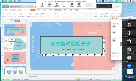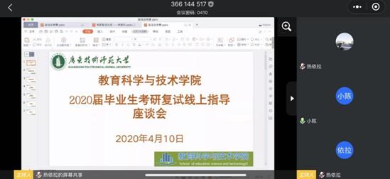我院非常重视毕业生考研复试指导工作,为帮助学生了解更多的复试环节,提高学生在考研复试中的竞争力,2020年4月10日,我院召开2020届毕业生考研复试线上指导座谈会。吴水爱副书记、陈丽君副院长、系主任张玲燕、陈雪梅老师、研究生辅导员梁爽、毕业班辅导员热依拉、15心理颖舒琪、15教技师林振玲同学和10名考研的同学参加座谈会。辅导员热依拉主持会议。