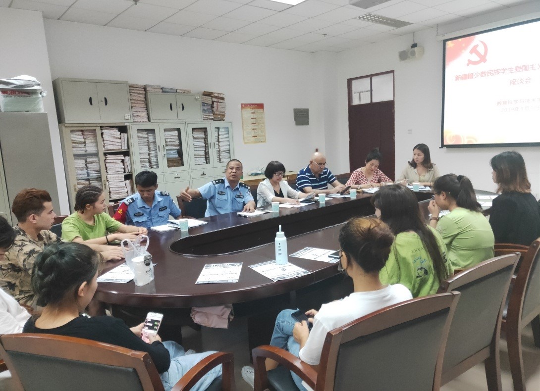 2019年9月30日下午,我院在白云校区第一教学楼315会议室召开新疆籍少数民族学生爱国主义教育及安全教育座谈会。江高镇派出所郭警官、蔡警官、学生处内派管理老师艾尔肯和吴芳老师、教科院党委吴水爱副书记、辅导员热依拉和新疆籍少数民族学生参加此次座谈会。