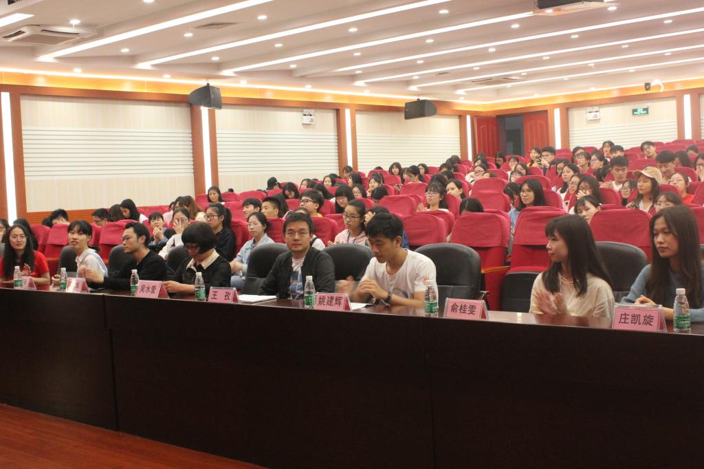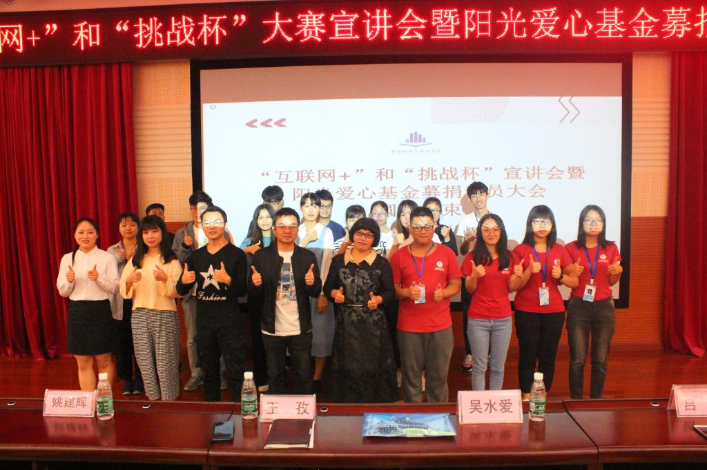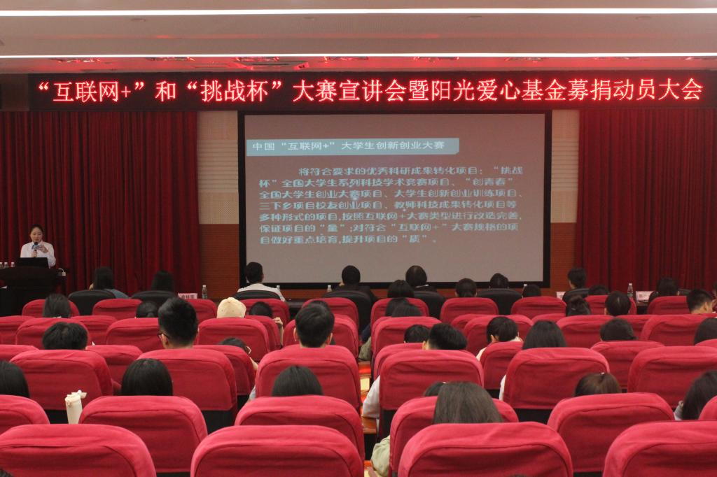 2019年4月18日晚,教育科学与技术学院“互联网+”和“挑战杯”大赛宣讲会暨阳光爱心基金募捐动员大会在三教104报告厅顺利举行。出席本次会议的嘉宾有党委副书记吴水爱、团总支书记王孜、汽车学院往届参加“挑战杯”优秀学生姚建辉、团总支副书记佘斯琦、团总支执行副书记张梓晓、学生会主席吕威、学生会副主席庄凯旋、黄丽萍、陈玉梅以及阳光爱心基金会前任会长俞桂雯。本次大会有两项议程:一是“挑战杯”和“互联网+”宣讲会,二是阳光爱心基金募捐大会。
