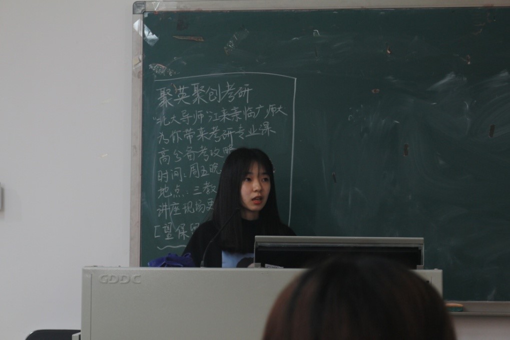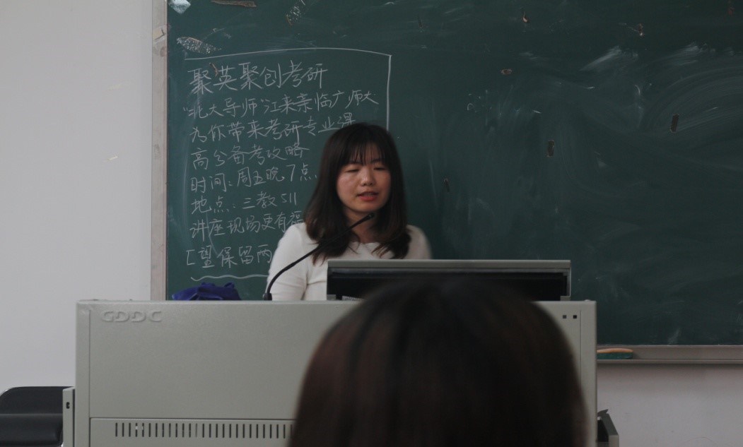 最后,2018届毕业生陈锦同学分享个人考研经历。她分出了几个步骤来讲述了自己当时备考的方法。也强调每个人都应该在决定之后一定要付出自己努力去达成自己定下的目标,即使在中间会受挫坚持不下去,也要学会调节自己的情绪。在分享最后,师姐衷心祝愿考研的同学们都可以如愿以偿。