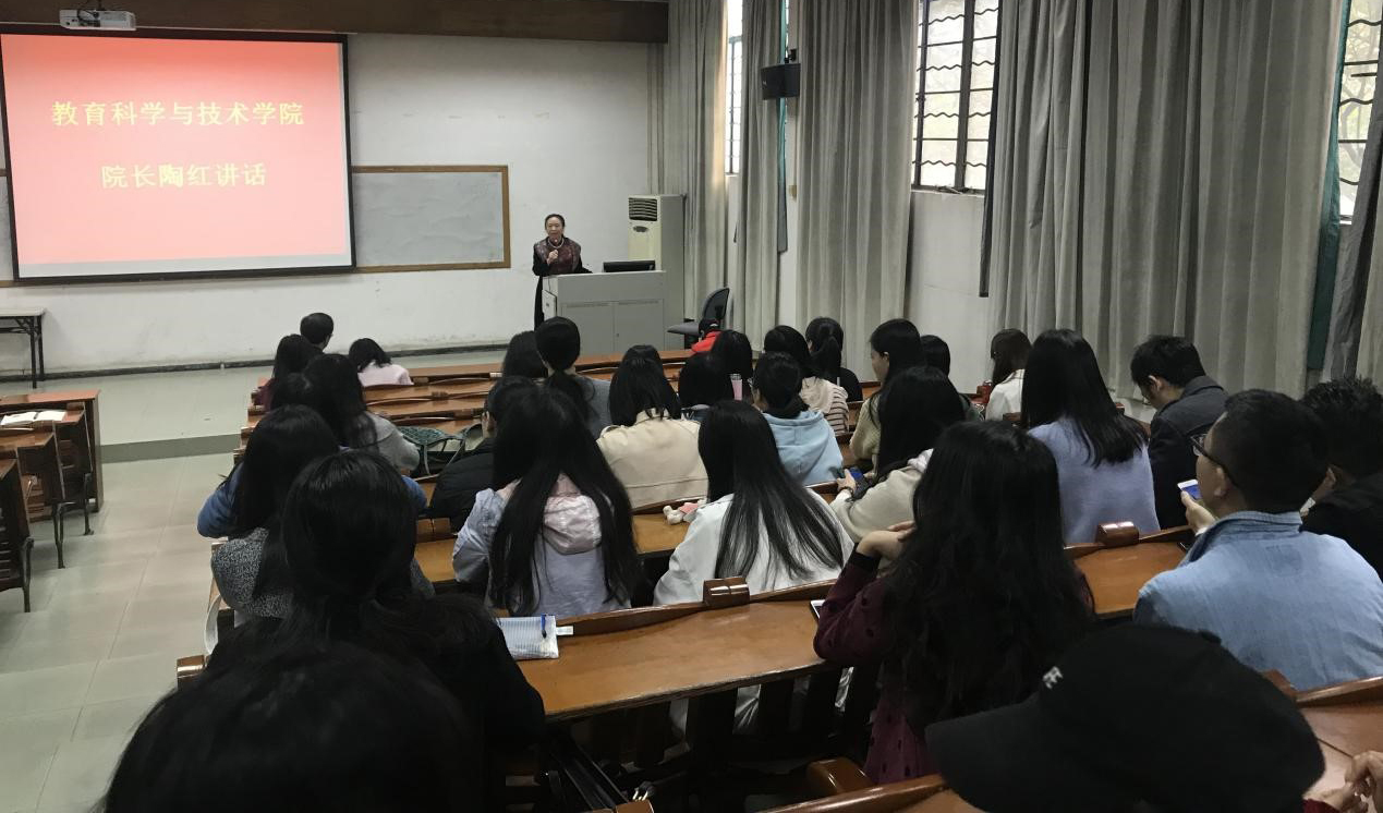 然后教育科学与技术学院院长陶红对这一学期的研究生工作进行总结。陶院长首先对全体研究生在这一个学期做出的努力表示肯定,并对18级研究生的身份和角色转换以及学习方式如何进行良好适应提出了建议;陶院长强调导师是研究生的第一责任人,教师和学生间良好关系的建立需要双方共同努力才能达成。在这过程中,导师要不断提高自己的科研和教学水平,学生也要不断的丰实和提升自己,共同成长;针对这一学期的研究生工作,陶院长强调要完善学院研究生的管理制度和方式,管理方式要做到粗中有细,为培养研究生的健全人格作出努力,研究生要受制度的约束,形成有序的组织纪律观念;最后陶红院长希望全体研究生在养成良好德性的前提下,做好学业的规划,用更高的学术标准来要求自己。寒假假期到来之际,陶院长叮嘱全体研究生注意假期安全并预祝同学们新年快乐!希望同学们即使是在假期也不要放松对自己的要求,可以利用这段时间进行学业上的反思和总结,有所收获。