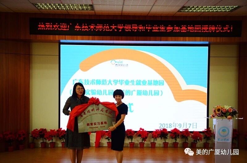 为了更好地建设与发展我校的学前教育专业,培养德才兼备的高素质学前教育应用型人才,9月7日,广东技术师范学院与美的教育(美的实验幼儿园、美的广厦幼儿园)在美的教育学术报告厅,举行了简短而隆重的“教育实习基地建设合作协议”签署及授牌仪式。我校教育科学与技术学院学前教育系主任孙文云副教授、美的教育梁结银董事长及管理团队、美的实验及美的广厦幼儿园行政领导班子,幼儿园教师代表及我校的实习老师出席了本次仪式。