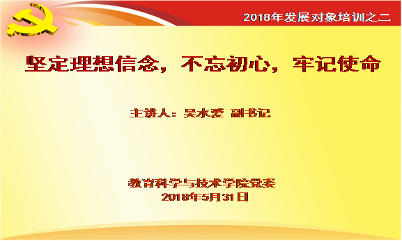 5月31日,教科院党委在一教1412举办了2018年发展对象专题培训 ,16名发展对象(教工1名,学生15名)参加了培训,党委吴水爱副书记作了《坚定理想信念,不忘初心,牢记使命》专题讲座。