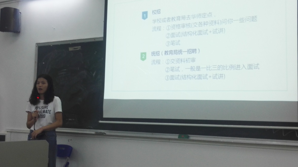 会上,首先由陈倩和张钦欣同学分享了考取公办学校心理教师的经验,以及自己准备招考的过程,备考过程遇到的问题等,并鼓励有意愿的同学努力备考,多尝试;接着张绚智同学为有意愿出国留学的同学讲解了自己的准备过程;庞伟峰同学针对自己在求职过程中遇到的各种问题,引导15级各位同学确定自己的目标。15心理的各位同学在交流会中都认真聆听了师兄师姐分享的经验和建议,并对自己存在疑问的地方进行了提问。