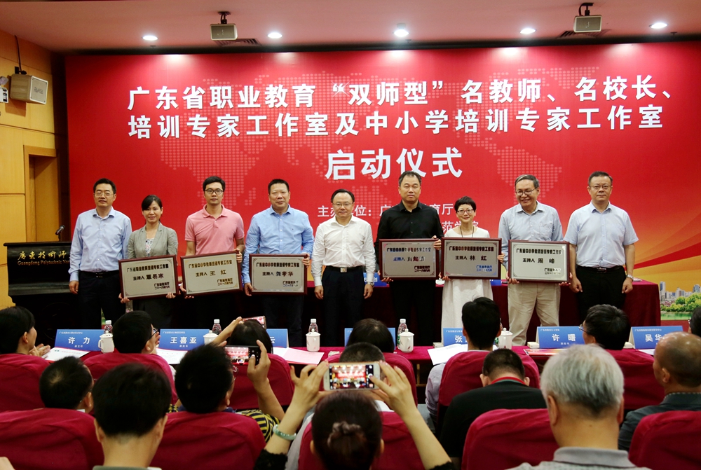 王创、廖荣辉、骆少明为广东省职业教育“双师型”名教师、名校长、培训专家工作室及中小学培训专家工作室授牌并合影留念。