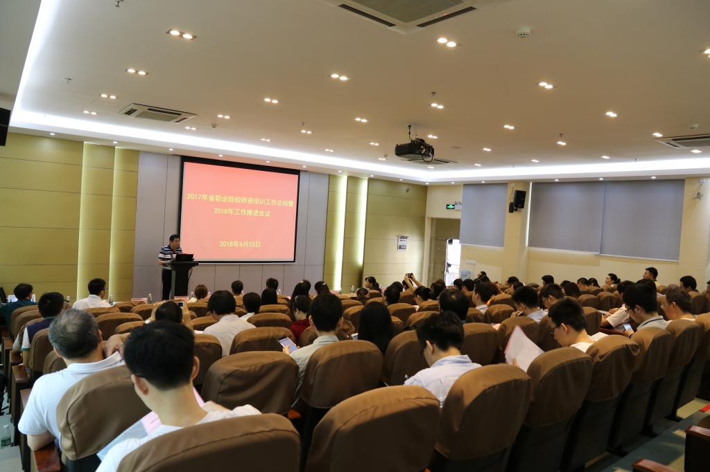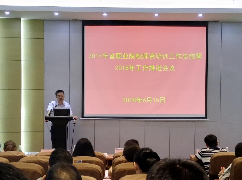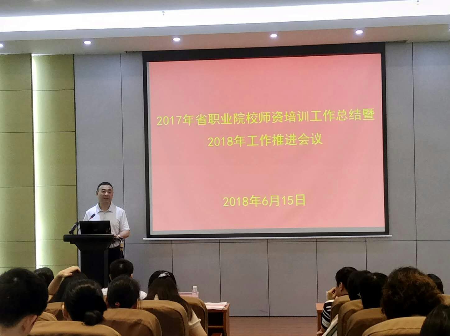郭杰院长致欢迎辞,他首先表达了对参会领导和专家的热烈欢迎,并介绍了我校概况和发展现状。项目办负责人对2017年度职业院校师资培训工作和2018年国培和省培推进落实情况进行了通报说明,并介绍了项目办下一步推进全省职业教师资培训工作的思路。