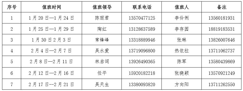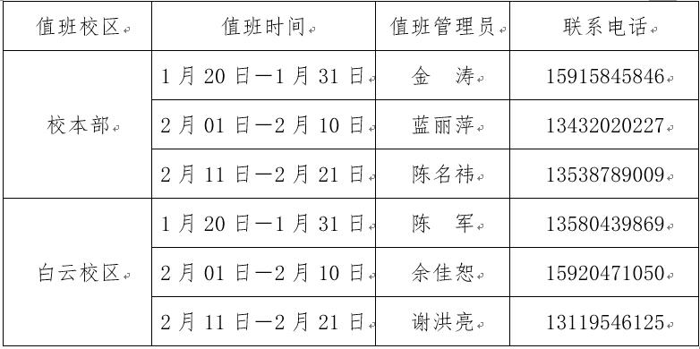根据学校放假安排,教师放假时间为2019年1月20日至2月21日。寒假期间,实验室将不对外开放,实验设备一律不外借。寒假期间实验中心的值班安排情况如下: